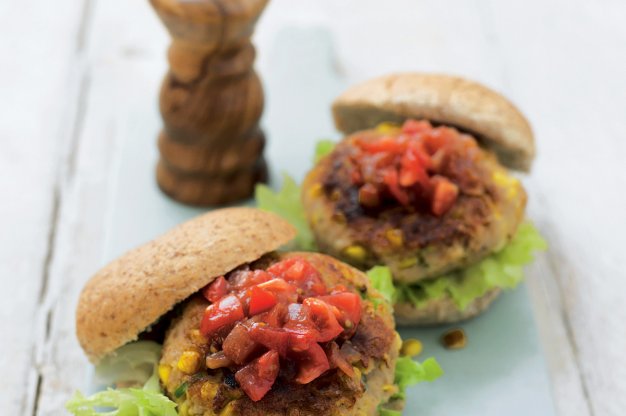 Do mixéru či chopperu vložte chléb a zpracujte na čerstvou strouhanku; přesypte ji do mísy. Do mixéru dejte polovinu kukuřice a najemno nasekejte. Nasekanou i nenasekanou kukuřici přisypte do mísy, přidejte tuňáka, sýr, jarní cibulky a trochu soli a pepře. Důkladně promíchejte. Po troškách přidejte vejce (možná nebude potřeba celé), aby vznikla lepivá hmota, z níž půjdou vytvarovat čtyři stejné karbanátky. Olej zahřejte v nepřilnavé pánvi a opečte na něm burgery, 5 minut z každé strany, dozlatova a aby byly uprostřed prohřáté. Opečené karbanátky vložte do rozkrojených žemlí vyložených listy salátu a na ně dejte kopečky salsy.