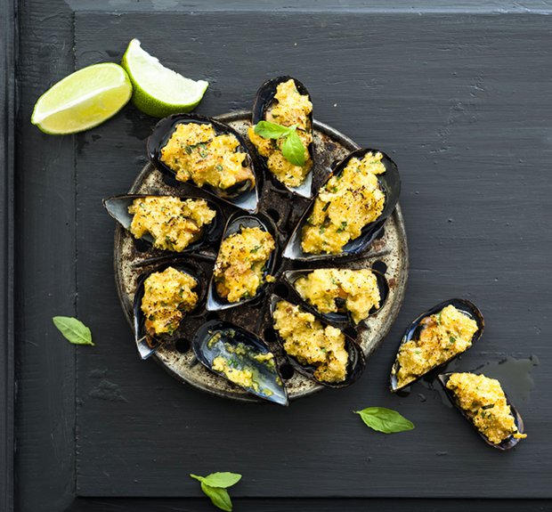 Troubu předehřejte na 200 stupňů. Očištěné slávky v hrnci podlijte vínem a přidejte česnek. Uveďte do varu a na mírném plameni pod pokličkou povařte 5–8 minut, až se mušle otevřou. Ty, které se neotevřely, vyhoďte. Promíchejte strouhanku, petržel, česnek, olej, bílek a šalvěj, směs osolte, opepřete a přidejte trochu chilli. Z každé mušle odstraňte volnou prázdnou lasturu a vzniklou nádivku naneste na lasturu s mušlí, rozložte je na plech, vložte do trouby a pečte 8 až 10 minut, až nádivka zpevní.