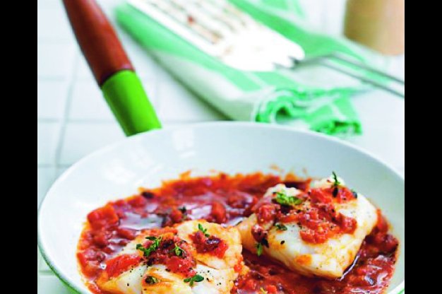 Na pánvi zahřejte olej, přisypte nasekanou cibuli a opékejte ji pět až osm minut, až je světle hnědá. Vmíchejte rajčata, přírodní cukr, tymiánové lístky a sójovou omáčku. Přiveďte k varu a vařte pět minut. Omáčku ochutnejte a případně podle potřeby osolte, opepřete nebo přidejte bylinky či sójovou omáčku. Pak do ní vložte rybu. Přiklopte a deset až dvacet minut duste na mírném ohni. Podávejte s vařenými nebo pečenými bramborami.