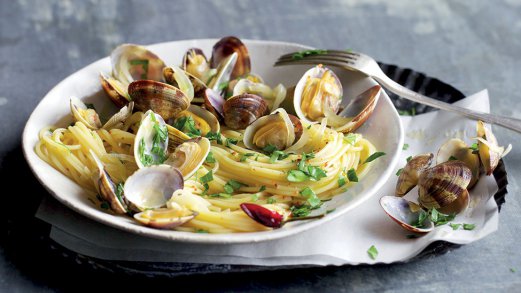 V hrnci rozehřejte olivový olej a máslo, přidejte nasekanou šalotku, česnek a chilli papričku zbavenou semínek, nechte zpěnit, pak přidejte bílé víno, sůl, pepř a očištěné mušle, přiklopte a vařte asi 2 minuty, dokud se tekutina částečně neodpaří a lastury neotevřou (zavřené odstraňte). Mezitím uvařte špagety podle návodu. Vsypte je do omáčky, přidejte nasekanou petržel a podávejte.