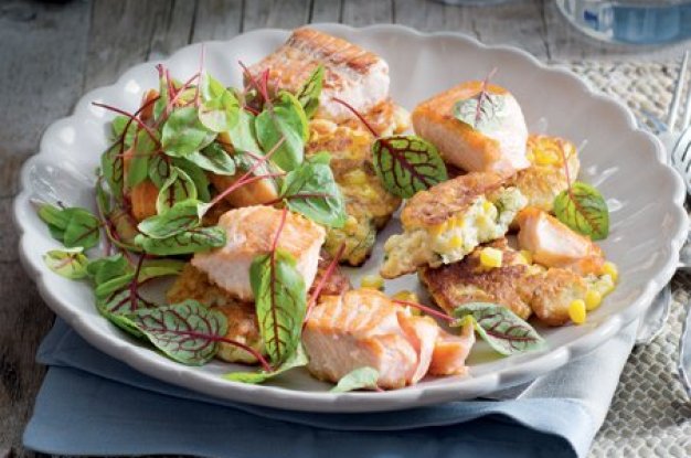 Do mísy prosejte mouku s kypřicím práškem, přidejte vejce, mléko a sýr, osolte, opepřete a lehce prošlehejte. Přidejte kukuřičná zrna a kopr a promíchejte.V pánvi na středním ohni rozpalte 2 lžíce olivového oleje. Na pánev naneste lžící několik hromádek kukuřičné směsi a rozetřete je na vyšší placky. Opékejte z každé strany asi 3 minuty dozlatova. Postupně stejným způsobem opečte všechny smaženky a uchovejte je teplé.Do pánve přilijte zbylý olej a opečte na něm filety lososa; z každé strany asi 4 minuty. Lososa osolte, opepřete a rozdělte na kousky. Rybu pak položte na smaženky a posypte zelenými lístky. Můžete podávat s citronem nakrájeným na klínky.