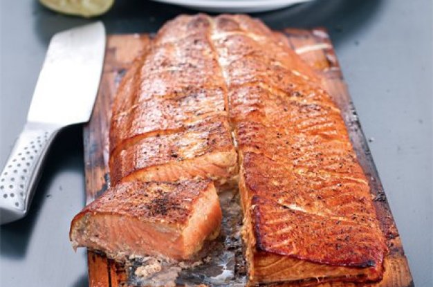 5) Opatrně a v rukavicích přeneste prkno s lososem na žáruvzdornou podložku. Podávejte přímo z prkénka nebo jednotlivé porce postupně podeberte a podávejte se svěžím salátem (recept dole).