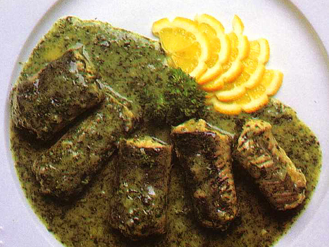 Maso opláchneme, lehce osušíme do kuchyňské utěrky a nakrájíme na několikacentimetrové kousky. Ty osolíme, opepříme a opečeme na rozehřátém tuku nebo oleji. Po chvilce k masu přidáme nakrájené kousky cibule. Potom zaprášíme moukou, krátce osmahneme a přilijeme rybí vývar (postačí z kostky). Vše dusíme pod pokličkou asi 10 minut. Bylinky omyjeme, osušíme a lístky nasekáme najemno. Maso vyjmeme a uložíme na teplou mísu nebo hlubší talíř. Omáčku ještě několik minut prudce povaříme za stálého míchání, aby se mírně zredukovala. Potom do ní vmícháme nasekané bylinky a smetanu, podle chuti dochutíme citrónovou šťávou, solí a pepřem. Omáčkou přelijeme úhoří maso a podáváme s opékanými bramborami nebo s rýží.
