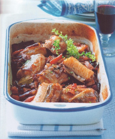 Úhoře naporcujte na špalíky, udělejte do nich několik zářezů, osolte a vložte je do rozpečené zeleniny. Přidejte máslo a zapečte. Potom podlijte vínem a dopékejte doměkka dalších 10-15 minut, podle tloušťky úhoře. Šťávu dochuťte a podávejte s čerstvou bagetou a citronem.
