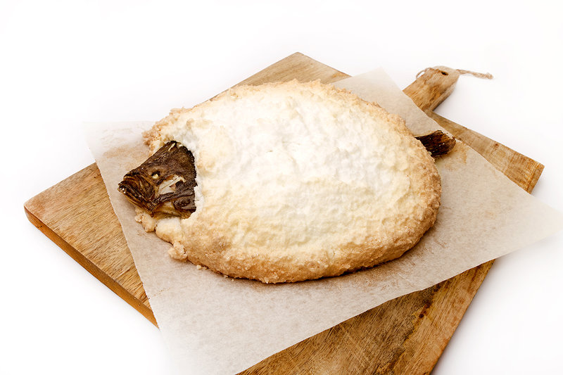 Rybu očistěte, mořská krusta se na ně nepřilepí. Rybu naplňte tymiánem a rozmarýnem, uvnitř osolte a celou opepřete. Bílky ušlehejte a smíchejte s mořskou solí. Na dno pekáče dejte polovinu připravené krusty, navrch položte rybu a zakryjte ji zbytkem bílků se solí. Pečte při 200 °C, v horkovzdušné troubě při 180 °C asi 45 minut. Vyndejte z trouby, nechte 5 minut odstát, krustu nařízněte nožem a sejměte ji. Poté pomocí rybího nože odstraňte kůži. Na pánvi si rozehřejte olej, přidejte cibuli, česnek a papriku. Krátce poduste, přidejte lilek, cuketu a zastříkněte martini. Chvíli povařte a nakonec přidejte rajčata. Osolte a opepřete.