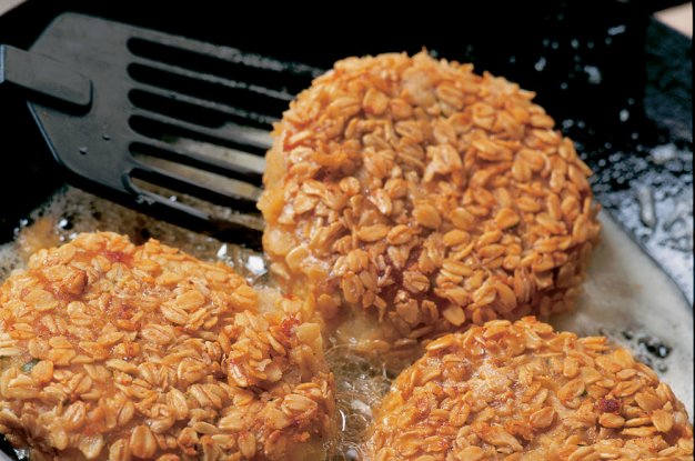 Brambory uvařte v osolené vodě doměkka; trvá to 15 až 20 minut. Rybu mezitím zalijte mlékem v misce vhodné do mikrovlnné trouby, překryjte fólií a na několika místech propíchněte. Vložte do mikrovlnky a povařte na nejvyšší stupeň asi čtyři minuty, aby se maso rozdělovalo na plátečky. Lžíci oleje rozehřejte na pánvi. Asi pět minut smažte cibuli a zázvor. Stáhněte z ohně a vmíchejte papriku. Povařené brambory i rybu sceďte, brambory rozmačkejte; z tresky stáhněte kůži a odstraňte případné zbylé kostičky. Brambory, rybu a cibulovou směs smíchejte s koriandrem, citronovou šťávou a spoustou pepře; dosolte. Rozdělte na osm dílků, vytvarujte placičky, smočte je v rozšlehaném vejci a důkladně obalte ve vločkách. Na talíři je překryjte fólií a nechte je aspoň půl hodiny v chladničce. Rozpalte zbylý olej a dozlatova na něm osmažte placičky; chce to pět až šest minut z každé strany. Pokud máte jen menší pánev, smažte je postupně, třeba po dvou, aby zlátly stejnoměrně. Pánev můžete mezi jednotlivými várkami vytřít kuchyňským papírem a vlít na ni čerstvý olej. Hotové placičky pokládeje na vrstvu ubrousků, které odsají přebytečný olej. Podávejte je horké, třeba s vařenými bramborami, případně s dipem z jogurtu a nastrouhané okurky.