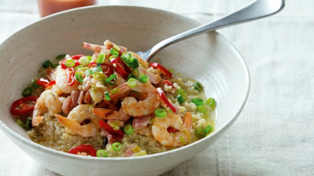 V rendlíku přiveďte na středním plameni k varu quinou s vývarem, pak oheň zmírněte. Přiklopte a zvolna vařte 15 minut, až se většina tekutiny vstřebá. Vmíchejte smetanový sýr a nastrouhejte kůru z poloviny citronu. Je třeba, aby směs měla trochu zplihlou konzistenci, je-li příliš pevná, přidejte ještě trochu smetanového sýra nebo maličko horké vody. Zatímco se quinoa vaří, ve velké pánvi na sředním ohni opečte na másle a olivovém olej polovinu chilli papričky, bílé části jarní cibulky, česnek a slaninu. Vložte půlku citronu řezem dolů. Opékejte, až začne slanina pouštět tuk a chytat barvu. Vsypte krevety a opékejte je 3-4 minuty, až začnou hezky růžovět. Vyjměte je z pánve. Opečený citron vymačkejte do pánve a vyškrábněte všechny drobné přípečky, aby vznikla rustikální omáčka. Krevety podávejte s quinoou, posypané slaninou a pokapané šťávou z pánve. Ozdobte zbývající chilli papričkou, pikantní pálivou omáčkou podle chuti a hrstí zelené části jarní cibulky.