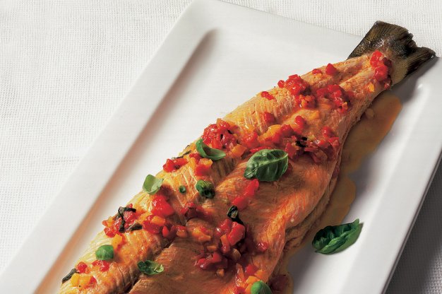Rybu upravte tak, aby se vešla do pekáče: odřízněte hlavu a větší část ocasu. Pak ji zvažte, abyste určili dobu vaření: na kilo hmotnosti budete potřebovat půl hodiny. Lososa důkladně opláchněte, osušte a zvenku i zevnitř důkladně osolte. Poté ho rovně položte do pekáče. Elektrickou troubu předehřejte na 160, horkovzdušnou na 140 stupňů, a připravte court bouillon. Všechny ingredience dejte do hrnce, zalijte jedním a půl litrem studené vody a uveďte do varu. Zmírněte plamen a dvacet minut lehce vařte. Hotový vývar přeceďte na rybu do pekáče. Ten potom pečlivě překryjte alobalem, vložte do trouby a pošírujte pětačtyřicet minut až hodinu; záleží na velikosti ryby. Mezitím připravte omáčku. Nasekané papriky a cibulku osmahněte na oleji; stačí cca pět minut. Otrhejte lístky z bazalky a dejte je stranou. Stonky nasekejte a spolu s octem a vínem přidejte do omáčky. Osolte ji, opepřete a nechte asi deset minut probublávat na mírném plameni. Pak omáčku ochutnejte a podle potřeby dolaďte. Na závěr do ní přidejte větší část nahrubo natrhaných lístků bazalky a odstavte omáčku stranou, aby krásně nasákla bylinkovou vůni.