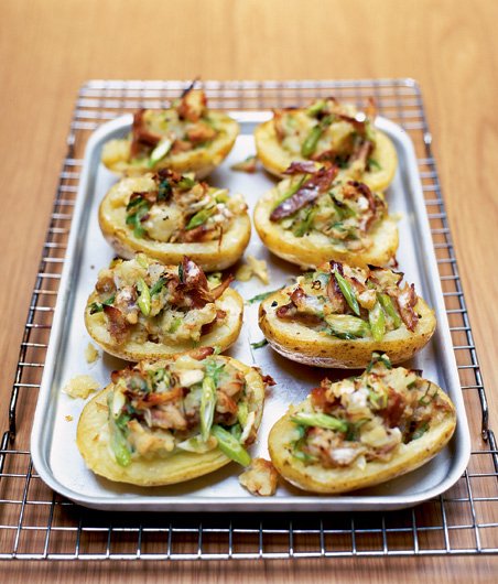 Vydrhnuté neloupané brambory uvařte doměkka. (Můžete je i propíchat a deset minut ,mikrovlnit‘ při nejvyšším výkonu; v půlce vaření je obraťte.) Pak je podélně rozpulte a lžičkou vydlabejte dřeň tak, aby vznikla jakási mistička. Předehřejte gril v troubě nebo ji zapněte na nejvyšší stupeň. Vidličkou rozmačkejte bramborovou dřeň s křenem nebo majonézou a mlékem; výsledkem by měla být krémovitá směs. Do té pak vetřete cibulku a kousky ryby. Podle chuti osolte, opepřete a směsí naplňte bramborové misky. Položte na plech, vyložený případně pečicím papírem, dejte do trouby a pět minut zapékejte, až se brambory prohřejí a zezlátnou.