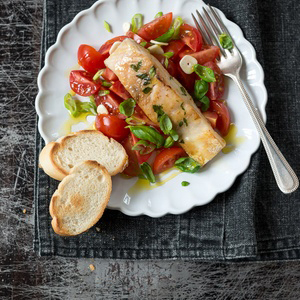 Okouna osolte, opepřete, posypte nasekaným tymiánem a zakápněte olivovým olejem. Na pánvi rozpalte zbylý olej a opečte rybu z obou stran lehce dozlatova. Podávejte s rajčatovým salátem.