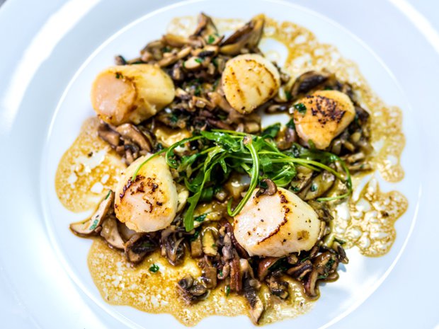 V kastrůlku rozehřejte olivový olej a orestujte na něm nadrobno nakrájenou šalotku a česnek. Přidejte pokrájené žampiony, osolte a opepřete a nechte restovat. Přidejte petrželku, promíchejte a kastrůlek dejte stranou. Na pánvičce rozehřejte olivový olej s trochou másla a orestujte na něm mušle. Orestované mušle vyndejte stranou a do pánve přidejte telecí šťávu, ořechový olej a kapku balzamikového octa. Nechte spojit. Na talíř nandejte houby, na ně položte orestované mušle, ozdobte čerstvou rukolou a zalijte šťávou s ořechovým olejem.