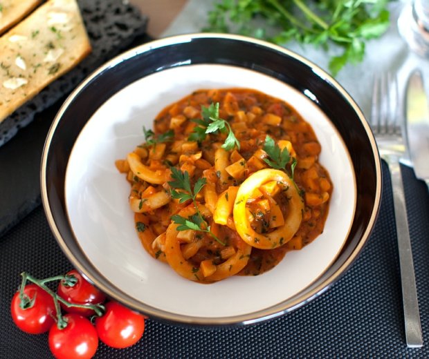 Kalamáry nakrájejte na kolečka. Mrkev s celerem očistěte a nakrájejte na 1 cm veliké kostičky. Šalotku oloupejte a nakrájejte na velmi malé kousky. Česnek oloupejte a nakrájejte na 2 mm tenké plátky. Z petržele si utrhněte pár lístků na ozdobu a zbytek petržele a tymiánu nasekejte na kousky cca 2 mm velké. Vezměte si kastrol a přidejte do něj 2 polévkové lžíce olivového oleje extra virgin. Na vysokém plameni nechte olej rozpálit. Když je olej dostatečně rozpálený, stáhněte na střední plamen, přidejte mrkev, šalotku, celer, tymián a polovinu z celkového množství česneku. Zeleninu krátce opékejte cca 3 minuty. Do opečené zeleniny přidejte kalamáry, bílé víno, rajčatový protlak a dochuťte solí a pepřem dle chuti. Kastrol přikryjte pokličkou a kalamáry duste cca 5 minut. Kalamáry vložte do misky nebo hlubokého talíře, ozdobte lístky petržele a servírujte s opečenou česnekovou bagetou.
