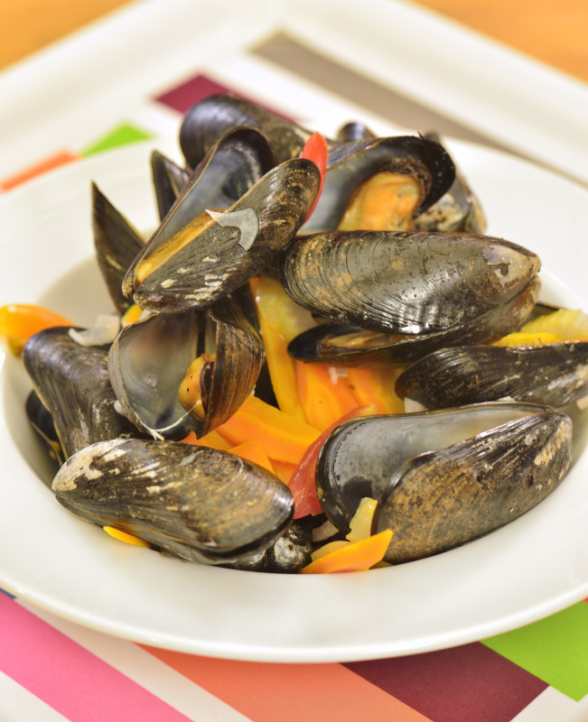 Do hrnce vložíme nakrájenou zeleninu kromě rajčat, přidáme bílé víno, očištěné mušle, sůl, mletý pepř. Přivedeme k varu, vaříme přiklopené 2 minuty. Poté prohodíme, přidáme rajčata, smetanu, rybí vývar a vaříme ještě 2 minuty. Podáváme s rozpečenou bagetkou.