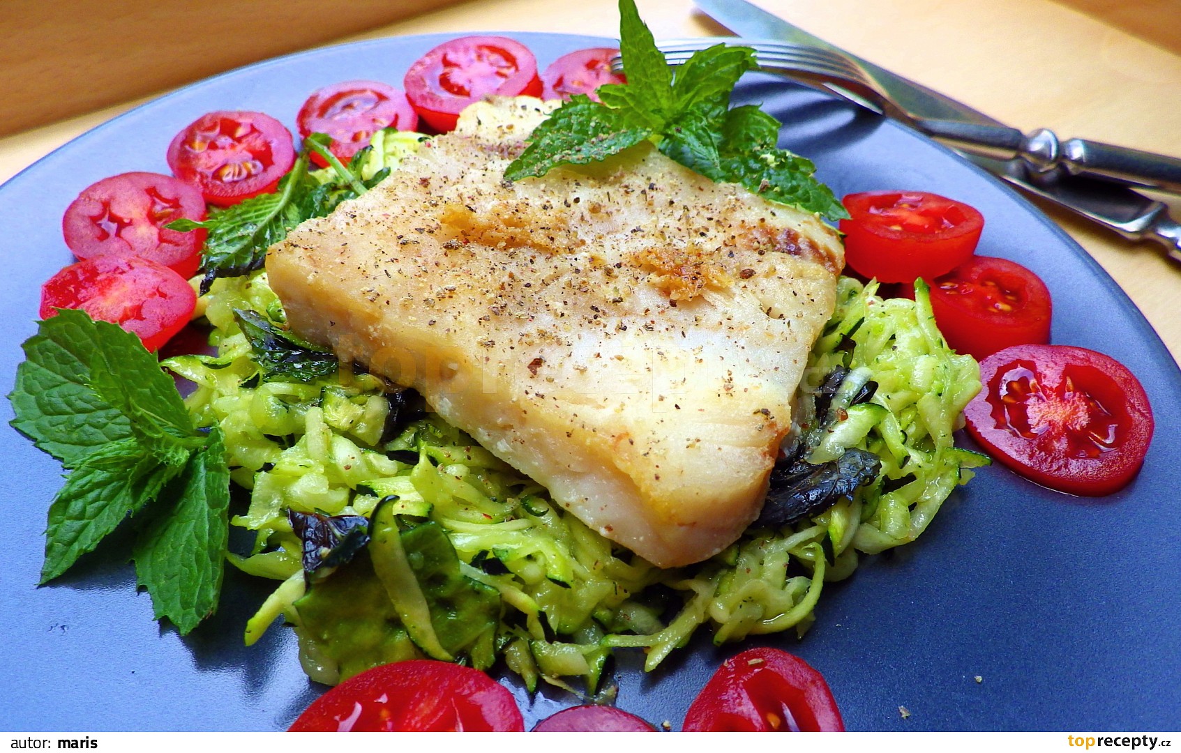 Cibuli nadrobno nakrájíme a orestujeme na ol. oleji, přidáme na plátky nakrájený česnek a dozlatova orestujeme. Poté přidáme důkladně omytou a nahrubo nastrouhanou cuketu a tak 15-20 minut dusíme, až je cuketa měkká. Nepodléváme vodou, cuketa ji sama pustí. Pouze osolíme a malinko opepříme. Tresku omyjeme a položíme do většího napařovacího hrnce tak, aby se vespod nalitá voda tresky nedotýkala. Do vody přidáme čerstvou šťávu z jednoho citronu, 1 lžičku soli, 2 lžičky sušeného tymiánu a špetku pepře. Tresku samotnou pokapeme čerstvou citr. šťávou.