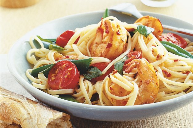 Ingredience na zálivku smíchejte v misce a dochuťte solí a pepřem. Nechte stranou. Těstoviny uvařte podle návodu na obalu tak, aby zůstaly pevné na skus. Na poslední minutu vaření k nim přisypte hrášek (pokud máte tzv. cukrový v luscích, překrájejte je šikmo na menší kousky). Mezitím rozehřejte ve velké silnostěnné pánvi nebo woku olej, vsypte do něj česnek i chilli papričku a na nepříliš silném plameni je asi půl minuty smažte, aby se česnek krásně rozvoněl, ale nezhnědl. Vsypte krevety, zvyšte teplotu a smažte zhruba tři minuty, až krevety zrůžoví. Přisypte rajčata a za občasného míchání asi tři minuty smažte. Těstoviny s hráškem sceďte a přisypte do pánve. Posypte lístky bazalky, natrhanými na menší kousky, osolte a opepřete. Salátové listy přelijte limetkovou zálivkou a podávejte k těstovinám; na stůl můžete dát i čerstvou bagetu, jíž ,vyluxujete‘ z talířů zbylou lahodnou šťávu.
