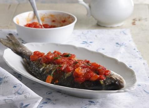 Pražmy osolíme, opepříme, každou na povrchu několikrát nařízneme a opečeme je z obou stran v pánvi na olivovém oleji. Rajčata na špičce nařízneme do kříže, ponoříme je na 2 minuty do vařící vody, ihned je zchladíme v ledové vodě, oloupeme je, nakrájíme na čtvrtky a vnitřní části se semínky odstraníme. Dužninu pak nakrájíme na menší kostky a promícháme v míse s chilli pastou, nasekaným koriandrem a petrželkou, pomerančovou šťávou, solí a pepřem. Opečené pražmy rozdělíme na talíře a na každou navršíme rajčatovou směs.