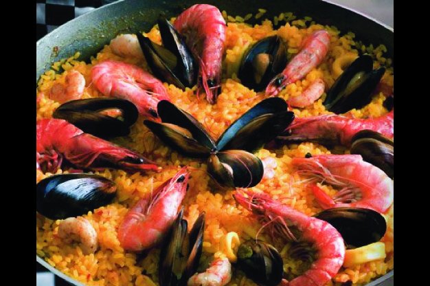 Ve velké pánvi rozehřejem olej, asi minutu na něm osmahneme krevety a langustínky a odložíme je stranou. Poté na pánvi osmahneme nakrájené olihně, přidáme kousky filetů, na drobno nakrájený česnek, cibuli, mletou papriku a šafrán. Promícháme a přidáme nakrájená rajčata a rýži. Poté zalijeme rybím vývarem, na rýži pokladem krevety a langustinky a vaříme na střední teplotě asi 20 minut, dokud se nevstřebá všechna tekutina.