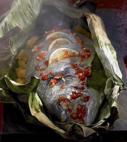Ryby vně i uvnitř dobře opláchněte a osušte. Kůži ryb několikrát šikmo nařízněte a do zářezů vsuňte několik na plátky nakrájených limetek. Pokrájenou dužinu z manga promíchejte se zbylými přísadami. Dostatečně velký kus papíru na pečení navlhčete a rozestřete na něj čtvrtinu mangové směsi. Doprostřed položte rybu, papír stočte, převažte kuchyňským provázkem, aby nemohla unikat šťáva. Položte na plech a pečte zhruba 25-30 minut v předehřáte troubě na 225 C.