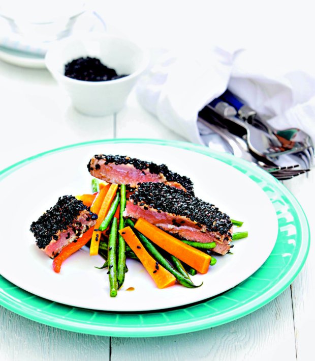 Tuňákový steak potřete sójovou omáčkou a pastou wasabi. Na talíř vysypejte sezamová semínka a tuňáka v nich ze všech stran obalte. Rozpalte pánev s olejem a steak opékejte z každé strany asi jednu minutu, neměl by být úplně propečený. Pánev odstavte z ohně a nechte pár minut odpočívat. Zeleninu nakrájejte na tenké plátky a krátce uvařte v páře, osolte a pokapejte citronovou šťávou. Steaky krájejte pod úhlem na silné plátky.