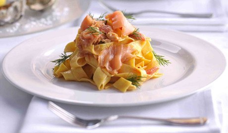 Čerstvého lososa nakrájíme na kostky, uzeného na kousky. Dáme si vařit těstoviny ,,al dente”. Kostky lososa povaříme v páře. Mezi tím si připravíme omáčku. Citrónovou šťávu dáme do kastrůlku a na mírnem ohni po částech přidáme máslo, sekaný kopr, smetanu a jikry. Dochutíme solí a pepřem. Přidáme uvařené a slité tagliatelle a promícháme. Podáváme s lososem a sekaným koprem. Jikry z lososa můžete nahradit zeleným hráškem.