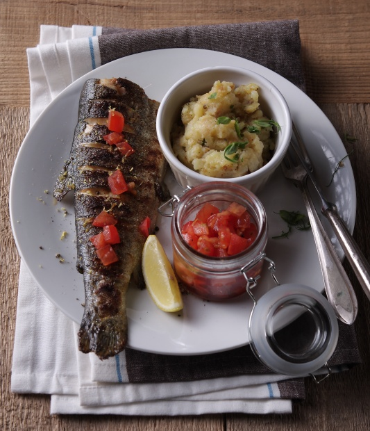 Pstruhy omyjeme, očistíme, odřízneme jim hlavy a nožem je napříč po obou stranách nařízneme. Potřeme je olejem, osolíme, opepříme a pomalu je opečeme z obou stran na kraji grilu. Uvařené brambory oloupeme, potřeme polovinou oleje, osolíme a zprudka je opečeme na středu grilu ze všech stran dozlatova. Pak na kraj grilu položíme hlubokou pánev s bylinkovým máslem, vložíme do ní grilované brambory, rozšťoucháme je a dochutíme solí a pepřem. Omytá rajčata nakrájíme nadrobno, smícháme je se zbylou lžící olivového oleje a ústřicovou omáčkou a opepříme. Pstruhy rozdělíme na talíře, posypeme je trochou strouhané citronové kůry a podáváme s brambory, rajčaty a citronem na dochucení.