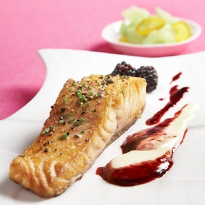 Nejdříve připravíme základ holandské omáčky. Do kastrůlku nalijeme bílé víno, přidáme oloupanou a jemně nakrájenou cibuli a pepř a společně svaříme asi na čtvrtinu původního množství. Směs přecedíme do kovové misky a necháme lehce zchladnout. Očištěné ostružiny podusíme asi 10 minut s červeným vínem a medem, propasírujeme do misky a udržujeme v teple. Do prochladlého základu na holandskou omáčku vešleháme žloutky, misku vložíme do teplé vodní lázně a směs vyšleháme do krémovité konzistence. Po částech vmícháme rozpuštěné máslo, omáčku podle chuti osolíme a udržujeme v teple. Porce lososa opláchneme, osušíme, stranu bez kůže posypeme pepřem a pažitkou a lehce osolíme. Vložíme je kůží dolů do pánve s rozehřátým olejem a zprudka opečeme. Když začnou lehce hnědnout, steaky otočíme a zprudka opékáme 2 minuty. Pak teplotu zmírníme a steaky zvolna dopečeme (maso by mělo uvnitř zůstat pružné). Steaky přeložíme na talíře, doplníme omáčkou a ostružinovým protlakem a podáváme.