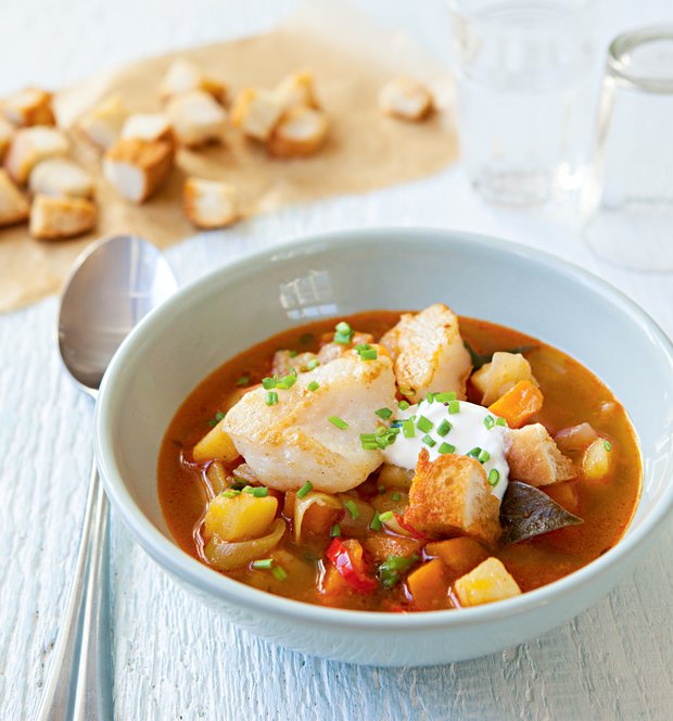 Ve velkém kastrolu na 3 lžících olivového oleje opečte jemně nakrájený česnek a cibuli. Oloupejte mrkev a brambory a oboje pokrájejte na malé kousky. Přidejte k cibuli a všechno dohromady na mírném plameni opékejte cca 10 minut za občasného zamíchání. Těsně před koncem přidejte očištěný pórek pokrájený na kolečka. Rybu pokrájejte na větší kousky, polovinu z nich dejte do hrnce, přidejte mletou papriku, osolte, opepřete a opékejte cca 3 minuty. Pak zalijte bílým vínem, přidejte bobkový list, šafrán, sušený tymián, pokrájenou očištěnou chilli papričku a nechte vše pár minut podusit. Přilejte litr ohřáté vody a vše cca 10 minut vařte (indikátorem konce budou měkké brambory). Mezitím pokrájejte pečivo na kostky a opečte je na pánvi na lžíci olivového oleje, osolte, dejte na stranu. Pánev očistěte, dejte na ni opět trochu oleje a opečte druhou polovinu ryby pokrájené na kousky – z každé strany jen cca 2–3 minuty podle tloušťky. I tu osolte. Hotovou polévku nalijte do talířů. Doprostřed talíře dejte kopeček kysané smetany, kolem něj naklaďte opečené kousky ryby z pánve, ozdobte čerstvými bylinkami a až na stole ať si každý přidá krutony. Na stůl postavte lahvičku ouza a lžíci, ať si každý dá podle své chuti.
