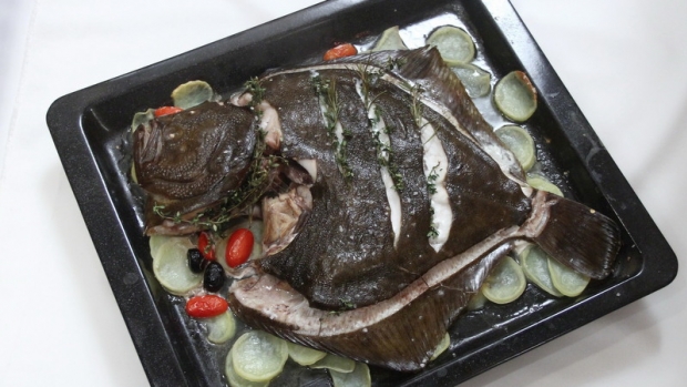 Plech potřeme olivovým olejem a vyskládáme najemno nakrájené brambory, přidáme na jemné plátky nakrájený česnek, černé olivy a rajčata. Na zeleninu položíme celou kambalu, které jsme do kůže udělali zářezy a vyplnili je snítkami tymiánu. Vše osolíme a přelijeme vínem a pečeme v předehřáté troubě na 180 stupňů/ 20 minut.
