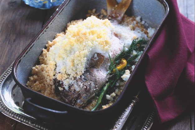 Rybu omyjte a osušte. Kůže by měla pokud možno zůstat v celku. Naplňte rybu bylinkami. Na dno většího pekáče nasypte kilo hrubé soli a položte na ni rybu. Pokud máte dost bylin, můžete je na ni klidně ještě naklást. Zbytek soli spojte v míse s bílky; směs později vytvoří požadovanou krustu. Hmotou překryjte rybu tak, aby nebyl vidět ani kousek. Povrch můžete ještě trošku pokropit vodou (stačí máchnout nad rybou mokrou rukou). Troubu vyhřejte na 180°C a vsuňte do ní pekáč. Doba pečení záleží na váze ryby: počítejte se čtvrthodinou na každého půl kila. Silnější rybu, jako je třeba losos, lze péct i při teplotě až 220°C . Pak počítejte s deseti minutami na každých 500 gramů. Po upečení porušte ztvrdlou krustu nožem a rybu jemně vyjměte. Podávejte nejlépe s bílým chlebem a jednoduchým salátem.