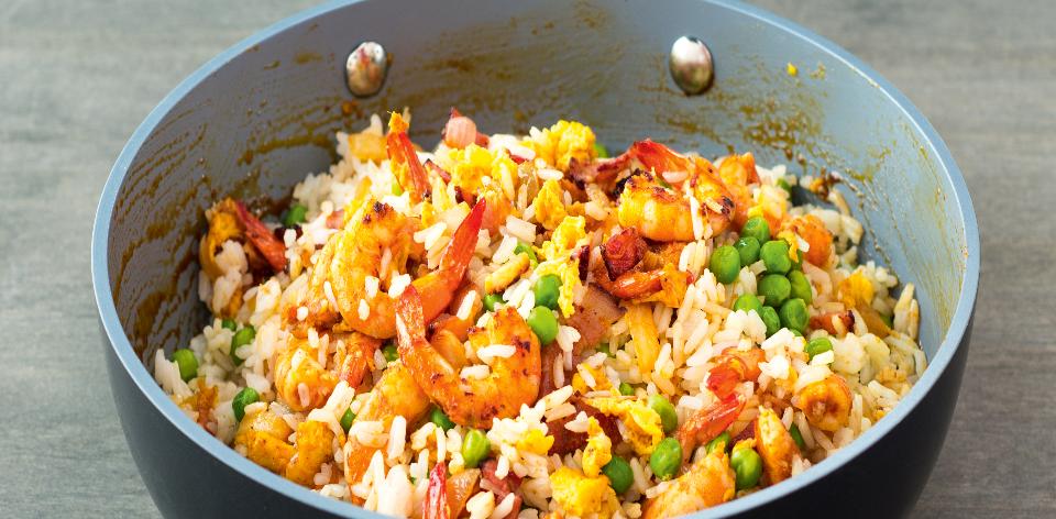 Rýži si uvaříme dle návodu. Ve woku nebo velké pánvi zahřejeme olej. Vsypeme česnek a chilli papričku a 10 vteřin opatrně opékáme, aby se nepřipekly. Vsypeme rýži, scezenou a okapanou, minutu zprudka smažíme za stálého míchání a pak ji shrnem k jedné straně pánve. Na volné místo vlijeme vejce a mícháme je, aby se srazila. Až budou skoro hotová, promícháme je s rýží, vsypeme hrášek, po 2 minutách přidáme krevety a sójovou omáčku, prohřejeme a podáváme.