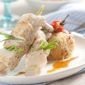 Halibuta nakrájíme na stejně velké kostky, osolíme, opepříme, pokapeme olivovým olejem a necháme odležet. Mezitím připravíme kuskus. Lilek nakrájíme na kostičky, osolíme, necháme asi 20 minut stát (vypotit) a pak je otřeme papírovou utěrkou. Omytou cuketu a papriky zbavené semínek také nakrájíme na kostičky a vše lehce orestujeme na olivovém oleji. Kuskus rozprostřeme na větší plech dobře vymaštěný olejem, zalijeme vroucím zeleninovým vývarem, přetáheme přes něj mikrotenovou fólii a necháme stát asi 7 - 8 minut (podle návodu na obalu). Pak k němu přidáme orestovanou zeleninu, promícháme a podle chuti přisolíme. V menší misce smícháme med, šťávu z limetky a postupně zašleháváme olivový olej, až omáčka mírně zhoustne. Pak vmícháme najemno nasekaný koriandr. Odleželého halibuta napíchneme na čtyři stejně dlouhé špízové jehly a zprudka opečeme ze všech stran na 3 lžících olivového oleje. Kuskus rozdělíme na talíře, položíme na něj špízy a přelijeme je připravenou omáčkou.