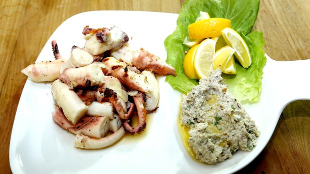 Chobotnici naložte do citronové šťávy a olivového oleje a nechte asi 2 hodiny marinovat v lednici. Pak maso pozvolna vařte v osolené vodě asi 20–30 minut. Na omáčku rozmixujte toustový chleba, přidejte tahini, nasekané ořechy, citronovou šťávu, sůl, pepř, chilli papričky a petrželku. V případě potřeby nařeďte vodou a spojte. Chobotnici očistěte, naporcujte, osolte, opepřete, pokapejte olivovým olejem a promíchejte. Na grilovací pánvi nechte rozehřát olivový olej a orestujte na něm maso ze všech stran. Přidejte česnek nakrájený na kolečka, pokapejte olejem, pokrájejte, nandejte na talíř a posypte ještě chilli. Pánev zalijte trochou vody, vzniklou omáčkou polijte chobotnici a podávejte spolu s tahini omáčkou, kterou jste zakápli olivovým olejem.